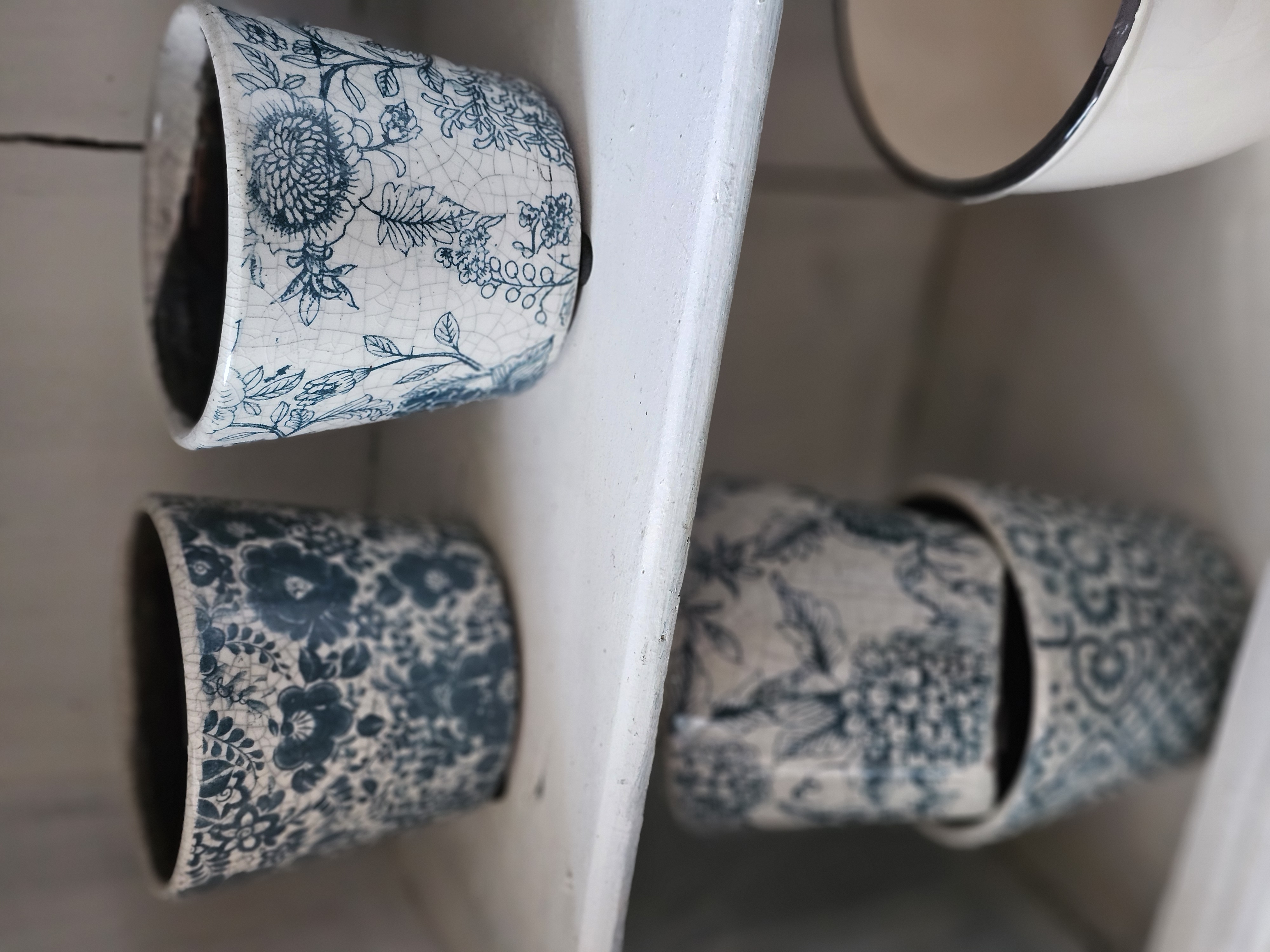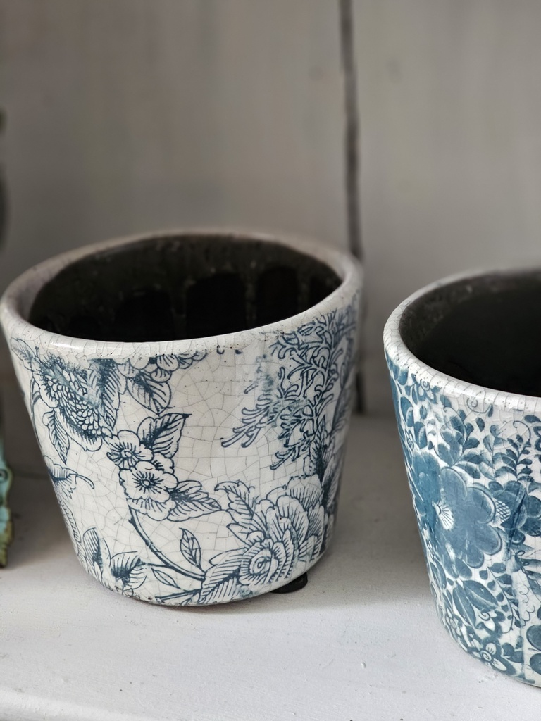 Das blaue Muster und die Krakelee Lasur machen den Topf aussergewöhnich schön Die Unregelmäßigkeiten und Abplatzungen sind gewollt und unterstreichen den Vintage-Look