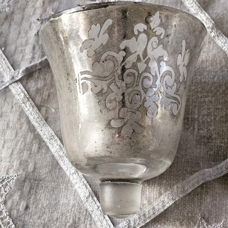 Der Glaskelch mit floralem Muster ist in Bauernsilber Optik gestaltet, welches den Vintage Stil unterstreicht