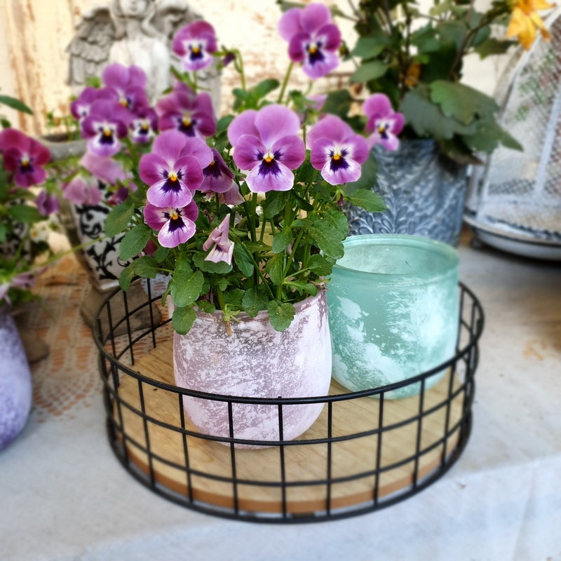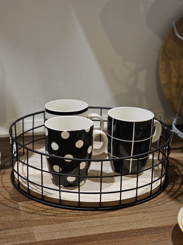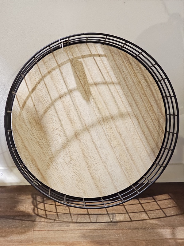 rundes Tablett zum Servieren und Dekorieren Der Korbrand ist aus stabilen Metall gearbeitet, im Boden liegt eine dicke Holzplatte.