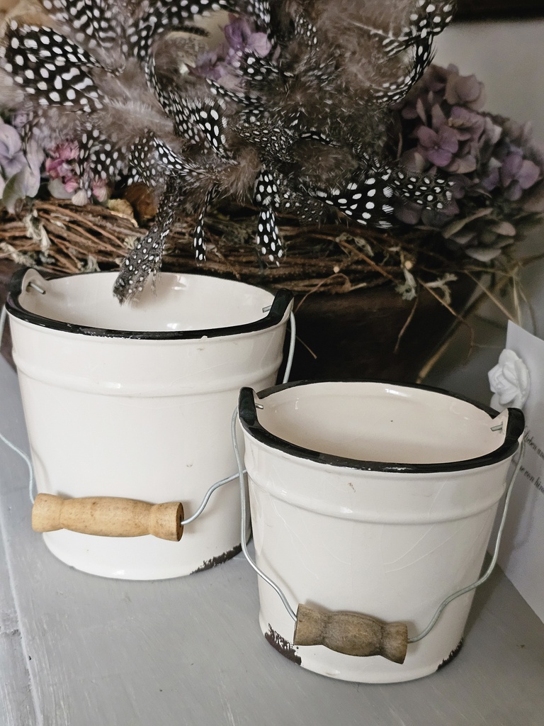Diese charmanten Übertöpfe sehen auf den ersten Blick aus wie klassische Emaille-Eimerchen vom Flohmarkt, überraschen jedoch durch ihre hochwertige Fertigung aus glasierter Keramik mit Krakelle Optik.