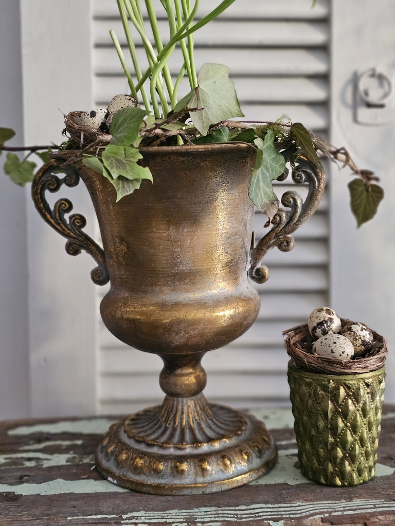 Gefäß: Klassische Pokalvase (Amphore) aus robustem Material mit antikem Gold-Finish und künstlicher Patina. Die geschwungenen Henkel und der verzierte Standfuß unterstreichen den Barock-Stil.